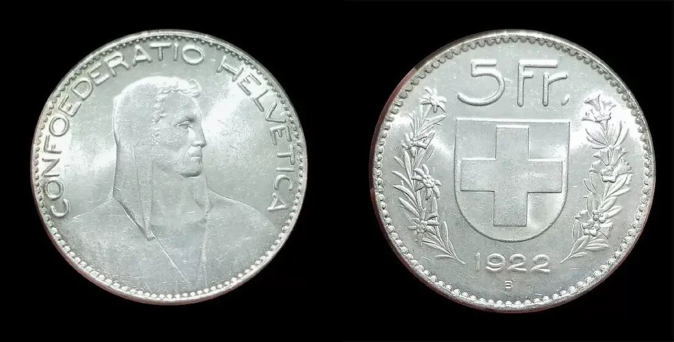 Switzerland 1922 5 FR, Superb Gem BU, Sharp Detail, Luster Fields. Rare Key Date