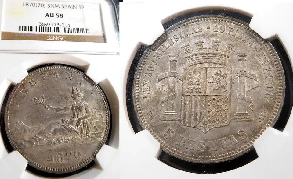 Spain 1870 5 Pesetas, Rare High Grade, NGC 58++, Full Head, Original, Few Graded